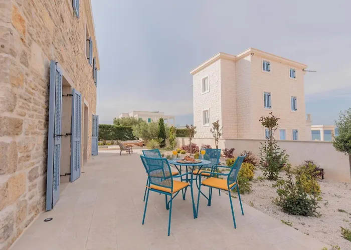 The beachfront Seafront Villa Adriatica With Pool Dobropoljana is located 10 minutes' drive from the Garmenjak and invites guests to enjoy a terrace.